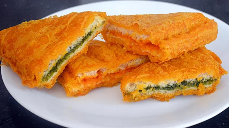 മെെദ, സോഡ പൊടി, മഞ്ഞൾ, പഞ്ചസാര എന്നിവ അൽപം വെള്ളം ചേർത്ത് ദോശ മാവ് പരുവത്തിൽ കുഴച്ചെടുക്കുക. ബ്രെഡ് രണ്ട് പീസായി മുറിച്ച് മാറ്റിവയ്ക്കുക. ശേഷം മുറിച്ച് വച്ച ബ്രെഡ് മാവിൽ മുക്കിയ ശേഷം എണ്ണയിൽ വറുത്തെടുക്കുക. തക്കാളി സോസിനൊപ്പം കഴിക്കാവുന്നതാണ്.