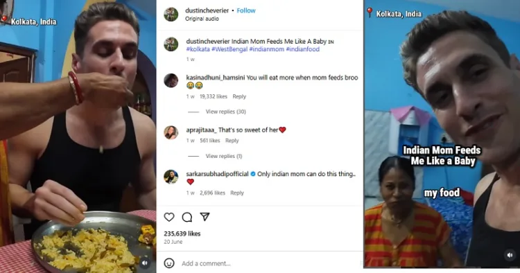 അമേരിക്കന്‍ വ്‌ളോഗർക്ക് ഒരു ഇന്ത്യന്‍ അമ്മ ശ്രദ്ധയോടെ ഭക്ഷണം നല്‍കുന്നതിന്റെ ഹൃദയസ്പര്‍ശിയായ വീഡിയോ ഇന്റര്‍നെറ്റിലുടനീളം ഹൃദയങ്ങളെ സ്പര്‍ശിച്ചു, ഗൃഹാതുരത്വത്തിന്റെയും സാംസ്‌കാരിക വിലമതിപ്പിന്റെയും വികാരങ്ങള്‍ ഉണര്‍ത്തി. വിയറ്റ്‌നാം ആസ്ഥാനമായുള്ള ഒരു കണ്ടന്റ് ക്രിയേറ്റര്‍ ഡസ്റ്റിന്‍ ഷെവേറിയര്‍ ഇന്ത്യ സന്ദര്‍ശന വേളയില്‍ ആദ്യം പങ്കിട്ട വീഡിയോ, ഇന്‍സ്റ്റാഗ്രാമില്‍ വൈറലായി.