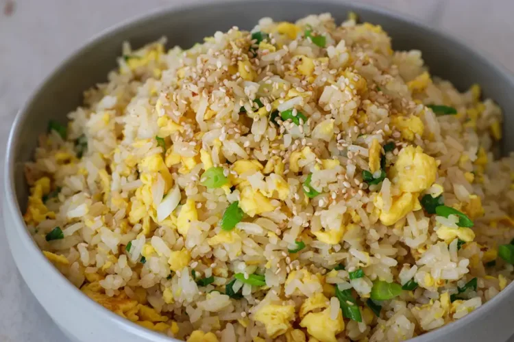 ചെറുതായി ഒന്നു വാടി വരുമ്പോൾ ഇതിലേക്കു നേരത്തെ വറത്തു വച്ചിരിക്കുന്ന മുട്ട ഇട്ടുകൊടുക്കാം. ഇനി ഇതിലേക്ക് വേവിച്ച് എടുത്തിരിക്കുന്ന ബസ്മതി റൈസ് ഇട്ട് കൊടുക്കാം. രണ്ട് ടീസ്പൂൺ സോയ സോസ്, രണ്ട് ടീസ്പൂൺ റെഡ് ചില്ലി സോസ്, കാൽ ടീസ്പൂൺ പഞ്ചസാര, കാൽ .ടീസ്പൂൺ കുരുമുളകുപൊടി എന്നിവ ചേർത്തു നന്നായി യോജിപ്പിച്ച് എടുക്കാം. ഇതിലേക്കു അരിഞ്ഞു വച്ചിരിക്കുന്ന സ്പ്രിങ് ഒണിയൻ കാൽ കപ്പ് ചേർത്തു എല്ലാംകൂടി നന്നായി ഒന്ന് ഇളക്കി യോജിപ്പിച്ചതിനുശേഷം സെർവിങ് പ്ലേറ്റിലേക്കു മാറ്റാം.