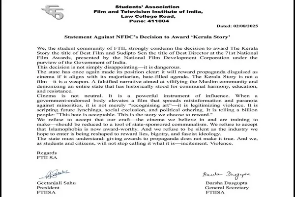 71ാമത് ദേശീയ ചലച്ചിത്ര അവാര്ഡുകള് ‘ദി കേരള സ്റ്റോറി’ക്ക് നല്കുന്നതിനെതിരെ പൂനെ ആസ്ഥാനമായുള്ള ഫിലിം ആന്ഡ് ടെലിവിഷന് ഇന്സ്റ്റിറ്റിയൂട്ട് ഓഫ് ഇന്ത്യ (എഫ്ടിഐഐ) വിദ്യാര്ത്ഥി സംഘടന ശക്തമായ എതിര്പ്പ് പ്രകടിപ്പിച്ചു. ‘ദി കേരള സ്റ്റോറി’ സംവിധാനം ചെയ്തതിന് സംവിധായകന് സുദീപ്തോ സെന്നിന് മികച്ച സംവിധായകനുള്ള അവാര്ഡ് നല്കാനുള്ള തീരുമാനത്തെ സംഘടന ശക്തമായി അപലപിച്ചു.