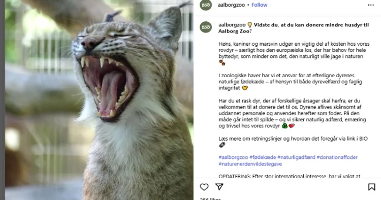 ‘കോഴികള്‍, മുയലുകള്‍, ഗിനി പന്നികള്‍ എന്നിവ നമ്മുടെ വേട്ടക്കാരുടെ ഭക്ഷണത്തിലെ ഒരു പ്രധാന ഭാഗമാണ്,’ ആല്‍ബോര്‍ഗ് മൃഗശാല അതിന്റെ ഇന്‍സ്റ്റാഗ്രാം പോസ്റ്റില്‍ വിശദീകരിച്ചു. ഈ രീതിയില്‍ നല്‍കുന്ന ഭക്ഷണം സിംഹവും, കടുവയുമുള്‍പ്പടെയുള്ള ‘സ്വാഭാവികമായും കാട്ടില്‍ വേട്ടയാടുന്ന’തിനെ ഓര്‍മ്മിപ്പിക്കുമെന്ന് അവര്‍ കൂട്ടിച്ചേര്‍ത്തു പ്രത്യേകിച്ച് ‘മുഴുവന്‍ ഇരയും ആവശ്യമുള്ള’ യുറേഷ്യന്‍ ലിങ്ക്‌സെന്ന കാട്ടുപൂച്ചയ്ക്ക് സമാനമായ ജീവിക്ക്. ‘വിവിധ കാരണങ്ങളാല്‍ അവിടെ നിന്ന് പോകേണ്ടിവരുന്ന ആരോഗ്യമുള്ള ഒരു മൃഗം നിങ്ങള്‍ക്കുണ്ടെങ്കില്‍, അത് ഞങ്ങള്‍ക്ക് ദാനം ചെയ്യാന്‍ മടിക്കേണ്ടതില്ല,’ എന്ന് അവര്‍ കൂട്ടിച്ചേര്‍ത്തു.