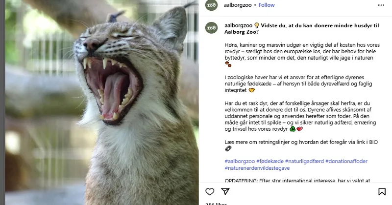 ‘കോഴികള്‍, മുയലുകള്‍, ഗിനി പന്നികള്‍ എന്നിവ നമ്മുടെ വേട്ടക്കാരുടെ ഭക്ഷണത്തിലെ ഒരു പ്രധാന ഭാഗമാണ്,’ ആല്‍ബോര്‍ഗ് മൃഗശാല അതിന്റെ ഇന്‍സ്റ്റാഗ്രാം പോസ്റ്റില്‍ വിശദീകരിച്ചു. ഈ രീതിയില്‍ നല്‍കുന്ന ഭക്ഷണം സിംഹവും, കടുവയുമുള്‍പ്പടെയുള്ള ‘സ്വാഭാവികമായും കാട്ടില്‍ വേട്ടയാടുന്ന’തിനെ ഓര്‍മ്മിപ്പിക്കുമെന്ന് അവര്‍ കൂട്ടിച്ചേര്‍ത്തു പ്രത്യേകിച്ച് ‘മുഴുവന്‍ ഇരയും ആവശ്യമുള്ള’ യുറേഷ്യന്‍ ലിങ്ക്‌സെന്ന കാട്ടുപൂച്ചയ്ക്ക് സമാനമായ ജീവിക്ക്. ‘വിവിധ കാരണങ്ങളാല്‍ അവിടെ നിന്ന് പോകേണ്ടിവരുന്ന ആരോഗ്യമുള്ള ഒരു മൃഗം നിങ്ങള്‍ക്കുണ്ടെങ്കില്‍, അത് ഞങ്ങള്‍ക്ക് ദാനം ചെയ്യാന്‍ മടിക്കേണ്ടതില്ല,’ എന്ന് അവര്‍ കൂട്ടിച്ചേര്‍ത്തു.