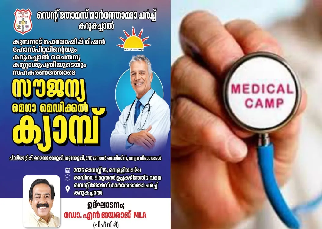 കറുകച്ചാല്: സെന്റ് തോമസ് മാര്ത്തോമ്മാ പള്ളിയുടെ ആഭിമുഖ്യത്തില് കുമ്പനാട് ഫെലോഷിപ്പ് മിഷന് ഹോസ്പിറ്റലിന്റെയും കറുകച്ചാല് ചൈതന്യ കണ്ണാശുപത്രിയുടെയും സഹകരണത്തോടെ 15ന് സൗജന്യ മെഗാ മെഡിക്കല് ക്യാമ്പ് നടത്തും.