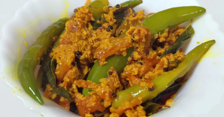 പച്ചമുളക് നന്നായി കഴുകി ഞെട്ട് കളഞ്ഞ് ഫോർക്കോ കത്തിയുടെ തലപ്പോ വച്ച് ഒന്ന് കുത്തിയെടുക്കുക. അതിലേക്കു തൈര് ആവശ്യത്തിന് ഉപ്പ് ചേർത്തിളക്കി മാറ്റിവയ്ക്കാം. ഒരു പാത്രത്തിൽ വെളിച്ചെണ്ണ ചൂടാക്കി കടുക്, ജീരകം, കറിവേപ്പില എന്നിവ വറുക്കുക. അതിലേക്ക് ഇഞ്ചിയും വെളുത്തുള്ളിയും സവാളയും അരിഞ്ഞതും ഒരു നുള്ള് ഉപ്പും ചേർത്ത് ഗോൾഡൻ നിറം വരുന്നത് വരെ വഴറ്റുക. അതിലേക്ക് മഞ്ഞൾ പൊടിയും മുളകു പൊടിയും ചേർത്തിളക്കി തീ അണയ്ക്കുക. അതിലേക്കു എടുത്തു വച്ച തൈരും മുളകും ചേർത്തിളക്കുക. അതിനുശേഷം തീ കുറച്ച് വയ്ക്കുക. ചേരുവകൾ നന്നായി ഇളക്കി അടച്ചു വച്ച് എണ്ണ തെളിയുന്നതു വരെ വേവിച്ച് അടുപ്പിൽനിന്നു വാങ്ങി വിളമ്പാം. മധുരം വേണമെങ്കിൽ ചെറിയൊരു കഷ്ണം ശർക്കര ചേർക്കാം.