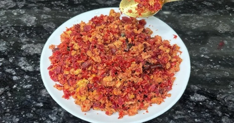 ഒരു ബീറ്റ്റൂട്ട് ചെറുതായി അരിഞ്ഞത് , ഒറു ചെറിയ സവാള ചെറുതായി അരിഞ്ഞത്, വെളുത്തുള്ളി ചതച്ചത്, പച്ചമുളക് അരിഞ്ഞത്, കുറച്ച് കറിവേപ്പില, ചിരകിയ തേങ്ങ അരകപ്പ്, മഞ്ഞൾപ്പൊടി, ആവശ്യത്തിന് ഉപ്പ് എന്നിവ ചേർത്ത് നന്നായി ഇളക്കുക. ഇനി പാൻ അടുപ്പിൽ വെച്ച് വെളിച്ചെണ്ണ ഒഴിച്ച് ഇളക്കി വെച്ചിരിക്കുന്ന ബീറ്റ്റൂട്ട് ചേർത്ത് അൽപനേരം വേവിവിക്കുക. ശേഷം വെന്തു വന്ന ബീറ്റ്റൂട്ടിലേയ്ക്ക് മൂന്ന് മുട്ട കൂടി പൊട്ടിച്ചൊഴിച്ച് രണ്ടു മൂന്ന് മിനിറ്റ് ഇളക്കി വേവിക്കുക.