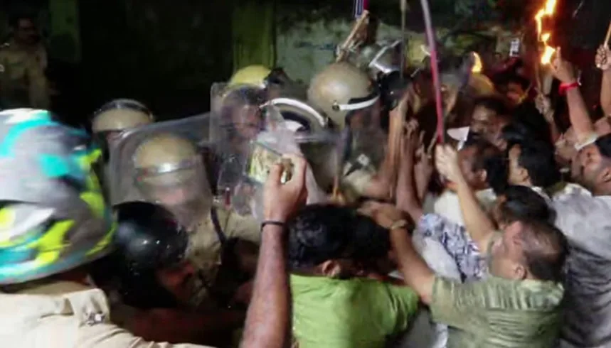 രാത്രി എട്ടുമണിയോടെ ബിജെപി പ്രവര്‍ത്തകര്‍ നടത്തിയ മാര്‍ച്ചില്‍ ഉന്തും തള്ളും കല്ലേറുമുണ്ടായി. ഇതോടെ പോലീസ് ലാത്തിച്ചാര്‍ജ് പ്രയോഗിച്ചു.