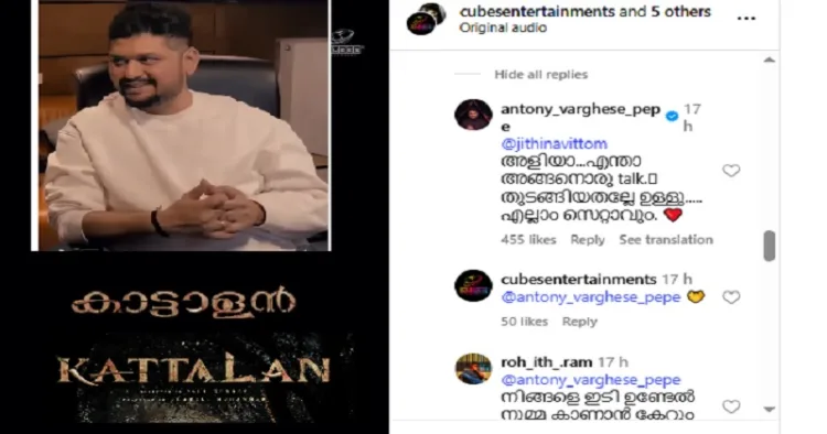 ‘മാർക്കോ’ എന്ന സൂപ്പർഹിറ്റ് ചിത്രത്തിന് ശേഷം ക്യൂബ്സ് എന്റർടെയ്ൻമെന്റ്സിന്റെ ബാനറിൽ ആന്റണി വർഗീസെന്ന പെപ്പെയെ നായകനാക്കി ഷരീഫ് മുഹമ്മദ് നിർമ്മിച്ച് നവാഗതനായ പോള് ജോര്ജ്ജ് സംവിധാനം ചെയ്യുന്ന പുതിയ ചിത്രമായ ‘കാട്ടാളൻ’ സിനിമയുടെ അണിയറപ്രവർത്തനങ്ങൾ പുരോഗമിച്ചുകൊണ്ടിരിക്കുകയാണ്. അതിനിടയിൽ സിനിമയിൽ സംഗീതമൊരുക്കുന്ന ‘കാന്താര’യുടെ സംഗീത സംവിധായകൻ അജനീഷ് ലോക്നാഥിന്റെ സിനിമകൾ ചേർത്തുവെച്ചൊരു വീഡിയോ കഴിഞ്ഞ ദിവസം ക്യൂബ്സ് എന്റർടെയ്ൻമെന്റ്സ് പുറത്തുവിട്ടിരുന്നു. വീഡിയോയ്ക്ക് താഴെ നെഗറ്റീവ് കമന്റടിച്ചുകൊണ്ടെത്തിയ ഒരാൾക്ക് തക്ക മറുപടി നൽകിയിരിക്കുകയാണ് ഇപ്പോള് പെപ്പെ.