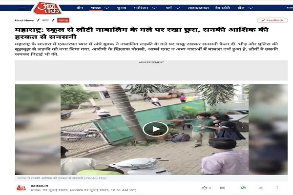 വൈറല്‍ വീഡിയോയിലെ കീ ഫ്രെയിമുകള്‍ ഉപയോഗിച്ച് ഗൂഗിളില്‍ നടത്തിയ റിവേഴ്‌സ് ഇമേജ് സെര്‍ച്ചില്‍ ചില കാര്യങ്ങള്‍ മനസിലാക്കി. ഇത് 2025 ജൂലൈ 22 ലെ ആജ് തക് റിപ്പോര്‍ട്ടിലേക്ക് ഞങ്ങളെ നയിച്ചു. ജൂലൈ 21 ന് വൈകുന്നേരം 4 മണിയോടെ മഹാരാഷ്ട്രയിലെ സത്താറ നഗരത്തിലെ ബസപ്പ പേത്ത് പ്രദേശത്ത് ആര്യന്‍ വാഗ്മലെ എന്ന യുവാവ് പ്രായപൂര്‍ത്തിയാകാത്ത ഒരു പെണ്‍കുട്ടിയെ കത്തിമുനയില്‍ നിര്‍ത്തിയതായി ഇതേ വീഡിയോ ഉള്‍പ്പെടുത്തിയിട്ടുണ്ട്. താമസിയാതെ, സമീപത്ത് നിന്നവര്‍ അവളെ രക്ഷപ്പെടുത്തി ആളെ മര്‍ദ്ദിച്ചുവെന്നും വ്യക്തമാക്കിയിട്ടുണ്ട്.