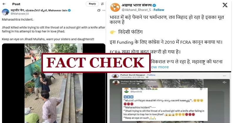 വര്‍ഗീയമായി തെറ്റായ വിവരങ്ങള്‍ പ്രചരിപ്പിക്കുന്നത് പതിവായി കണ്ടെത്തിയ ‘ മഹാവീര്‍ബവിജെ ‘ എന്ന എക്‌സ് ഹാന്‍ഡില്‍ ഉപയോക്താവ് വീഡിയോ പങ്കിട്ടു, ‘ലവ് ജിഹാദില്‍’ കുടുക്കാന്‍ കഴിയാത്തതിനാല്‍ കത്തി ഉപയോഗിച്ച് ഒരു സ്‌കൂള്‍ വിദ്യാര്‍ത്ഥിനിയുടെ കഴുത്ത് അറുക്കാന്‍ ശ്രമിക്കുന്നതിനിടെ ഒരു ‘ജിഹാദി’ കൊല്ലപ്പെട്ട മഹാരാഷ്ട്രയില്‍ നിന്നുള്ള ഒരു സംഭവമാണിതെന്ന് അദ്ദേഹം വിശേഷിപ്പിച്ചു. ‘ജിഹാദി മുല്ലമാരെ (മുസ്ലീങ്ങളെ അപമാനിക്കുന്ന പദം) നിരീക്ഷിക്കുക’ എന്നാണ് അടിക്കുറിപ്പ്. നിങ്ങളുടെ സഹോദരിമാര്‍ക്കും പെണ്‍മക്കള്‍ക്കും മുന്നറിയിപ്പ് നല്‍കുക.’