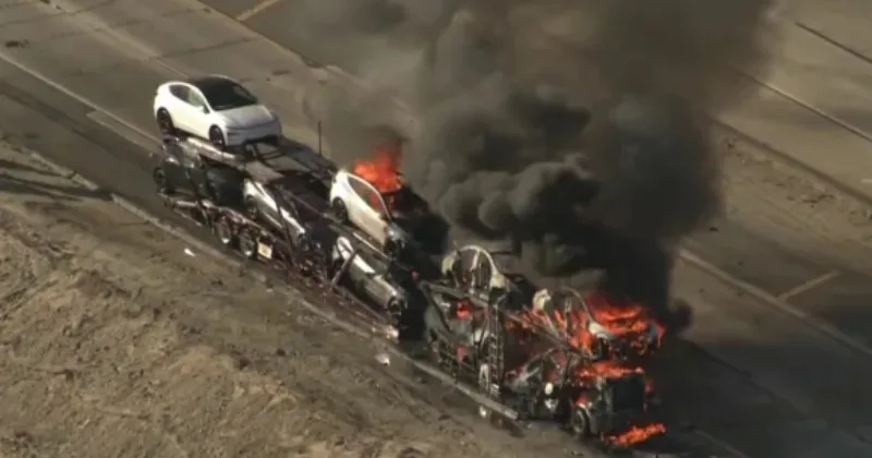 ടെസ്ലയുടെ ഇലക്ട്രിക് കാറുകളുമായി പോയ ട്രക്കിന് തീപ്പിടിച്ചു. ആറ് കാറുകൾ പൂർണമായും കത്തിനശിച്ചു. സിൽമറിലെ ഗോൾഡൻ സ്റ്റേറ്റ് ഫ്രീവേയിലാണ് അപകടമുണ്ടായതെന്ന് അന്താരാഷ്ട്ര മാധ്യമങ്ങൾ റിപ്പോർട്ട് ചെയ്തു. തീപ്പിടിത്ത വിവരമറിഞ്ഞ് അഗ്നിരക്ഷാസേന എത്തിയപ്പോഴേക്കും കാറുകളിലേറെയും കത്തിനശിച്ചതായി ലോസ് ആഞ്ചലീസ് അഗ്നിരക്ഷാവിഭാഗം പറഞ്ഞു.