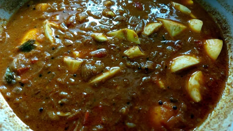 ഒരു .പാനിൽ എണ്ണ ചൂടാക്കി കടുകു പൊട്ടിക്കുക അരിഞ്ഞ ഉരുളക്കിഴങ്ങും ഉള്ളിയും പച്ചമുളകും അൽപ്പം മഞ്ഞൾപ്പൊടി ചേർത്ത് വഴറ്റുക . ശേഷം തക്കാളി ചേർക്കാം ഇതിലേക്ക് ഉപ്പും ചേർത്ത് അടച്ചു മൂടി വേവിക്കുക ഇനി തയ്യാറാക്കി വെച്ചിരിക്കുന്ന അരപ്പുംമുട്ടയും ചേർത്ത് നന്നായിളക്കി 10 മിനിട്ടു അടച്ചു വേവിച്ചു ശേഷം ഗ്രേവി ഒന്ന് കുറുകുമ്പോൾ കറിവേപ്പില ചേർത്ത് വാങ്ങാം