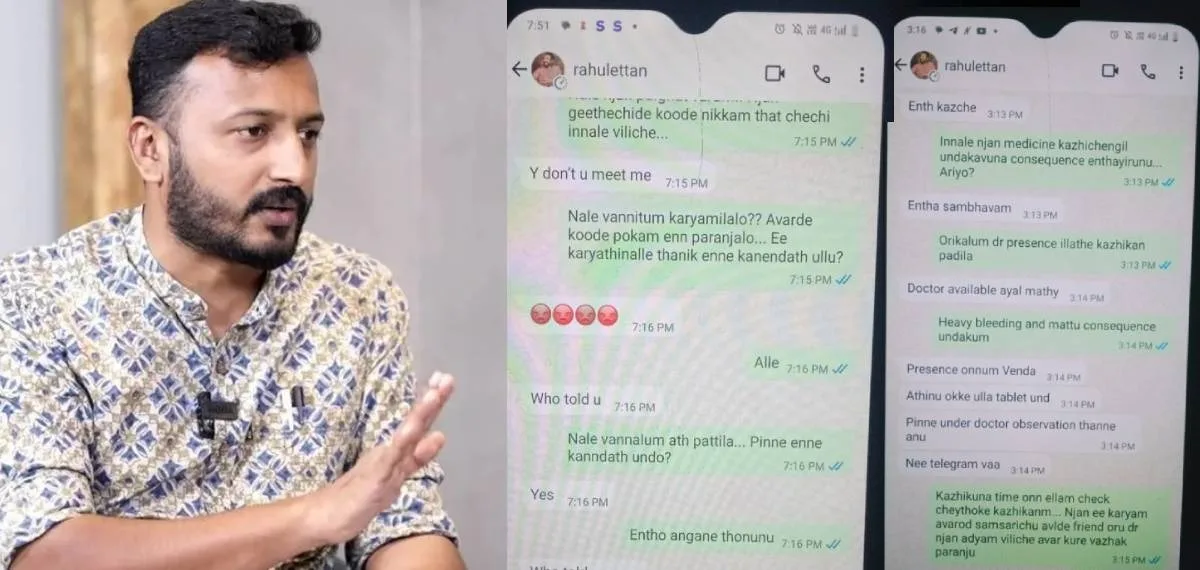 ഗർഭഛിദ്രം നടത്താൻ ഡോക്ടറെ കാണേണ്ടതില്ലെന്നും അതിനൊക്കെയുളള മരുന്നുണ്ടെന്നും ഉൾപ്പെടെ യുവതിയോട് രാഹുൽ പറയുന്നുണ്ട്. അമിത രക്തസ്രാവവും മറ്റ് പ്രശ്നങ്ങളും ഉണ്ടാകുമെന്ന് യുവതി പറഞ്ഞപ്പോൾ ഡോക്ടറുടെ നിരീക്ഷണത്തിൽ തന്നെയാണ് എന്നാണ് രാഹുൽ പറഞ്ഞത്. എന്റെ തലയിൽ ഇട്ടിട്ട് ഒഴിഞ്ഞുമാറുകയാണോ എന്നും കേറിചെന്ന ഉടൻ ഡോക്ടർമാർ മരുന്ന് നൽകില്ലെന്നും എത്രനാൾ ഇത് മൂടിവെച്ച് താൻ നടക്കുമെന്നും യുവതി രാഹുലിനോട് വാട്ട്സാപ്പിലൂടെ ചോദിക്കുന്നുണ്ട്. എങ്ങനെ മുന്നോട്ടുപോകുമെന്ന പേടിയും വയറ്റിലുളള കുഞ്ഞിനോടുളള ഇഷ്ടവും, അതിനിടയിൽ വീർപ്പുമുട്ടുകയാണെന്നും താൻ ഒരു സ്ത്രീയാണെന്നും യുവതി പറഞ്ഞപ്പോൾ എങ്കിൽ നീ തന്നെ പ്രശ്നം തീർക്കൂ എന്നായിരുന്നു രാഹുലിന്റെ മറുപടി.