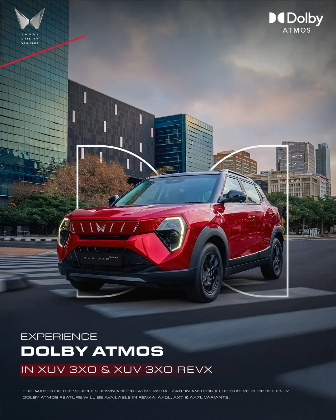 എക്സ് യുവി 3എക്സ്ഒയുടെ ക്യാബിന് ഘടനയ്ക്ക് അനുസരിച്ച് പ്രത്യേകം ട്യൂണ് ചെയ്ത ആറ് സ്പീക്കര് ഓഡിയോ ലേഔട്ടാണ് ഈ വാഹനത്തിലുള്ളത്. ഏറ്റവും ഉയര്ന്ന വകഭേദമായ എഎക്സ് 7 എല് വേരിയന്റില് ഒരു അധിക സബ് വൂഫറും ഉണ്ട്. ഡോള്ബി അറ്റ്മോസുള്ള എക്സ് യുവി 3എക്സ്ഒയുടെ ഈ നാല് വേരിയന്റുകളും സെപ്റ്റംബര് പകുതിയോടെ വിതരണം ചെയ്തു തുടങ്ങും.ഡോള്ബി അറ്റ്മോസ് ഫീച്ചര് ചെയ്യുന്ന മഹീന്ദ്രയുടെ നാലാമത്തെ വാഹന ശ്രേണിയാണ് എക്സ് യുവി 3എക്സ്ഒ. നേരത്തെ ബിഇ6, എക്സ്ഇവി 9ഇ ഇ-എസ്യുവികളിലും ഥാര് റോക്സിലുമാണ് ഡോള്ബി അറ്റ്മോസുള്ളത്.