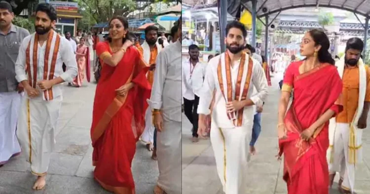 കസവു വെള്ള പട്ടു ദോത്തിയും ഷർട്ടും ധരിച്ചാണ് നാഗചൈതന്യ എത്തിയത്. ശോഭിത ചുവന്ന പട്ടുസാരിയിൽ അതിമനോഹരിയായി കാണപ്പെട്ടു.