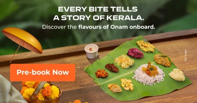 ഓണത്തോടനുബന്ധിച്ച് കേരളത്തിലെ നാല് വിമാനത്താവളങ്ങളില് നിന്നും മംഗലാപുരത്ത് നിന്നും വിദേശത്തേക്കും തിരിച്ചും യാത്ര ചെയ്യുന്നവര്ക്ക് ആകാശത്ത് ഓണ സദ്യ ഒരുക്കി എയര് ഇന്ത്യ എക്സ്പ്രസ്. ഓഗസ്റ്റ് 24 മുതല് സെപ്റ്റംബര് ആറ് വരെ യാത്ര ചെയ്യുന്നവര്ക്ക് എയര് ഇന്ത്യ എക്സ്പ്രസ് വെബ്സൈറ്റിലൂടെയും മോബൈല് ആപ്പിലൂടെയും യാത്ര പുറപ്പെടുന്നതിന് 18 മണിക്കൂര് മുന്പ് വരെ ഓണ സദ്യ മുന്കൂര് ബുക്ക് ചെയ്യാം.