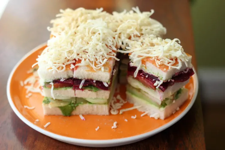 ബ്രെഡ് സ്ലൈസുകൾ, വേവിച്ച ഉരുളക്കിഴങ്ങ്, ബീറ്റ്റൂട്ട്, സവാള, കുക്കുമ്പർ, വെണ്ണ, ചാട്ട് മസാല, മല്ലിയില ചട്നി.