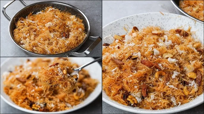 ഇതിലേയ്ക്ക് സേമിയ കൂടെ ചേർത്ത് സേമിയയുടെ നിറം മാറി വരുന്നത് വരെ ഏകദേശം 3-4 മിനിറ്റ് ഇളക്കികൊടുക്കുക. ഖോയ കൂടെ ചേർത്ത് നന്നായി ഇളക്കുക. ഖോയ നന്നായി അലിഞ്ഞ്, സേമിയ മൃദുവാകുന്നത് വരെ പാകം ചെയ്യണം. ഇതിലേയ്ക്ക് ചൂടുവെള്ളം കൂടെ ചേർക്കുക. വെള്ളം തിളച്ച് വറ്റി വരണം. എന്നാൽ ഡ്രൈ ആകാതിരിക്കാനും ശ്രദ്ധിക്കണം. ഇതിലേയ്ക്ക് പഞ്ചസാര കൂടെ ചേർത്ത് നന്നായി ഇളക്കണം. തുടർച്ചയായി ഇളക്കികൊണ്ടേയിരിക്കണം. മീഡിയം തീയിൽ 3-4 മിനിറ്റ് പാകം ചെയ്യുക. ഇനി തീ അണച്ച് ഒരു പത്ത് മിനിറ്റ് ഇതൊന്ന് മാറ്റി വെയ്ക്കാം. ശേഷം പിസ്ത, ബദാം എന്നിവ ചേർത്ത് അലങ്കരിച്ച ശേഷം രുചികരമായ ഈ സേമിയ മധുരം വിളമ്പാവുന്നതാണ്.