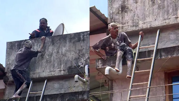 അനുനയിപ്പിച്ച് താഴെയിറക്കാൻ ശ്രമിച്ച പൊലീസ്, ഫയർഫോഴ്സ് ഉദ്യോഗസ്ഥർക്ക് നേരെ അസഭ്യ പ്രയോഗവും യുവാവ് നടത്തിയിരുന്നു.ഒരു മണിക്കൂറിലധികമായി ഇയാൾ ഒരു പ്രദേശത്തെയാകെ മുൾമുനയിൽ നിർത്തി. കെട്ടിടത്തിൽ നിന്നും വടികളും മറ്റും താഴെ തടിച്ചുനിൽക്കുന്ന ആൽക്കൂട്ടത്തിന് നേരെ എറിയുകയും ചെയ്തു. മൂന്ന് നിലയുള്ള ഒരു കെട്ടിടത്തിന് മുകളിൽ കയറിനിന്നാണ് ഭീഷണി മുഴക്കിയത്. അവിടെയുണ്ടായിരുന്ന പെയിന്റ് തലയിലൂടെ കോരിയൊഴിച്ച ശേഷമാണ് ഇത്തരം പ്രകടനങ്ങൾ നടത്തിയത്. ഇയാൾ ആരാണെന്ന് വ്യക്തമല്ല. മുൻപ് കണ്ടിട്ടില്ലെന്ന് പ്രദേശവാസികൾ പറയുന്നു.