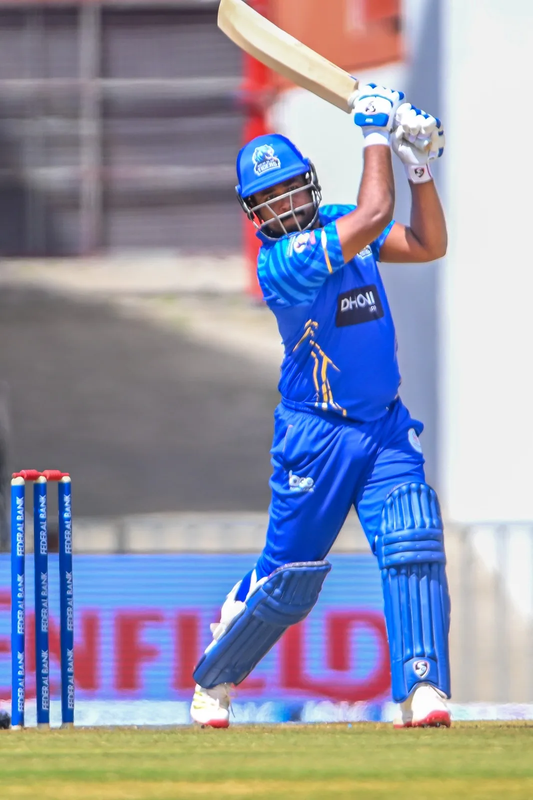 തുടർച്ചയായ രണ്ടാം മല്സരത്തിലും സഞ്ജു സാംസൺ തന്നെയായിരുന്നു കൊച്ചിയുടെ ഇന്നിങ്സിനെ മുന്നിൽ നിന്ന് നയിച്ചത്. രണ്ടാം ഓവറിൽ തന്നെ ഓപ്പണർ വിനൂപ് മനോഹരൻ പുറത്തായെങ്കിലും തുടർന്നെത്തിയ മുഹമ്മദ് ഷാനുവും സഞ്ജുവും ചേർന്ന് കൊച്ചിയ്ക്ക് മികച്ച തുടക്കം നല്കി. ആനന്ദ് ജോസഫ് എറിഞ്ഞ നാലാം ഓവർ മുതൽ സഞ്ജു ആഞ്ഞടിച്ചു. രണ്ട് സിക്സും ഒരു ഫോറുമടക്കം 18 റൺസാണ് ആ ഓവറിൽ സഞ്ജു നേടിയത്. സഞ്ജുവിൻ്റെ മികവിൽ കൊച്ചി ആറാം ഓവറിൽ അൻപത് റൺസ് പിന്നിട്ടു. 26 പന്തുകളിൽ നിന്ന് സഞ്ജു അർദ്ധ സെഞ്ച്വറിയും പൂർത്തിയാക്കി.ഇരുവരും ചേർന്ന രണ്ടാം വിക്കറ്റ് കൂട്ടുകെട്ടിൽ 76 റൺസ് പിറന്നു. 24 റൺസെടുത്ത ഷാനുവിനെ പുറത്താക്കി അജിനാസാണ് ഈ കൂട്ടുകെട്ടിന് അവസാനമിട്ടത്. തുടർന്നെത്തിയ നിഖിൽ തോട്ടത്ത് 18ഉം സാലി സാംസൻ 16ഉം റൺസുമായി മടങ്ങി. മറുവശത്ത് കൂറ്റൻ ഷോട്ടുകളുമായി സഞ്ജു ബാറ്റിങ് തുടർന്നു. എന്നാൽ അജിനാസ് എറിഞ്ഞ 18ആം ഓവർ നിർണ്ണായകമായി. ഓവറിലെ രണ്ടാം പന്തിൽ ആനന്ദ് കൃഷ്ണൻ പിടിച്ച് സഞ്ജു സാംസൺ പുറത്തായി. 46 പന്തുകളിൽ നാല് ഫോറും എട്ട് സിക്സും അടക്കം 89 റൺസാണ് സഞ്ജു നേടിയത്. തൊട്ടടുത്ത പന്തിൽ പി എസ് ജെറിനും അടുത്ത പന്തിൽ മൊഹമ്മദ് ആഷിഖും പുറത്താകുമ്പോൾ അജിനാസ് ഹാട്രിക്കും അഞ്ച് വിക്കറ്റ് നേട്ടവും പൂർത്തിയാക്കി. 13 പന്തുകളിൽ 22 റൺസുമായി പുറത്താകാതെ നിന്ന ആൽഫി ഫ്രാൻസിസിൻ്റെ പ്രകടനം കൂടി ചേർന്നപ്പോൾ കൊച്ചിയുടെ ഇന്നിങ്സ് 188ൽ അവസാനിച്ചു. നാലോവറിൽ 30 റൺസ് മാത്രം വിട്ടുകൊടുത്താണ് അജിനാസ് അഞ്ച് വിക്കറ്റ് വീഴ്ത്തിയത്. നാലോവറിൽ 24 റൺസ് മാത്രം വിട്ടു കൊടുത്ത് ഒരു വിക്കറ്റ് വീഴ്ത്തിയ സിബിൻ ഗിരീഷും തൃശൂർ ബൌളിങ് നിരയിൽ തിളങ്ങി.