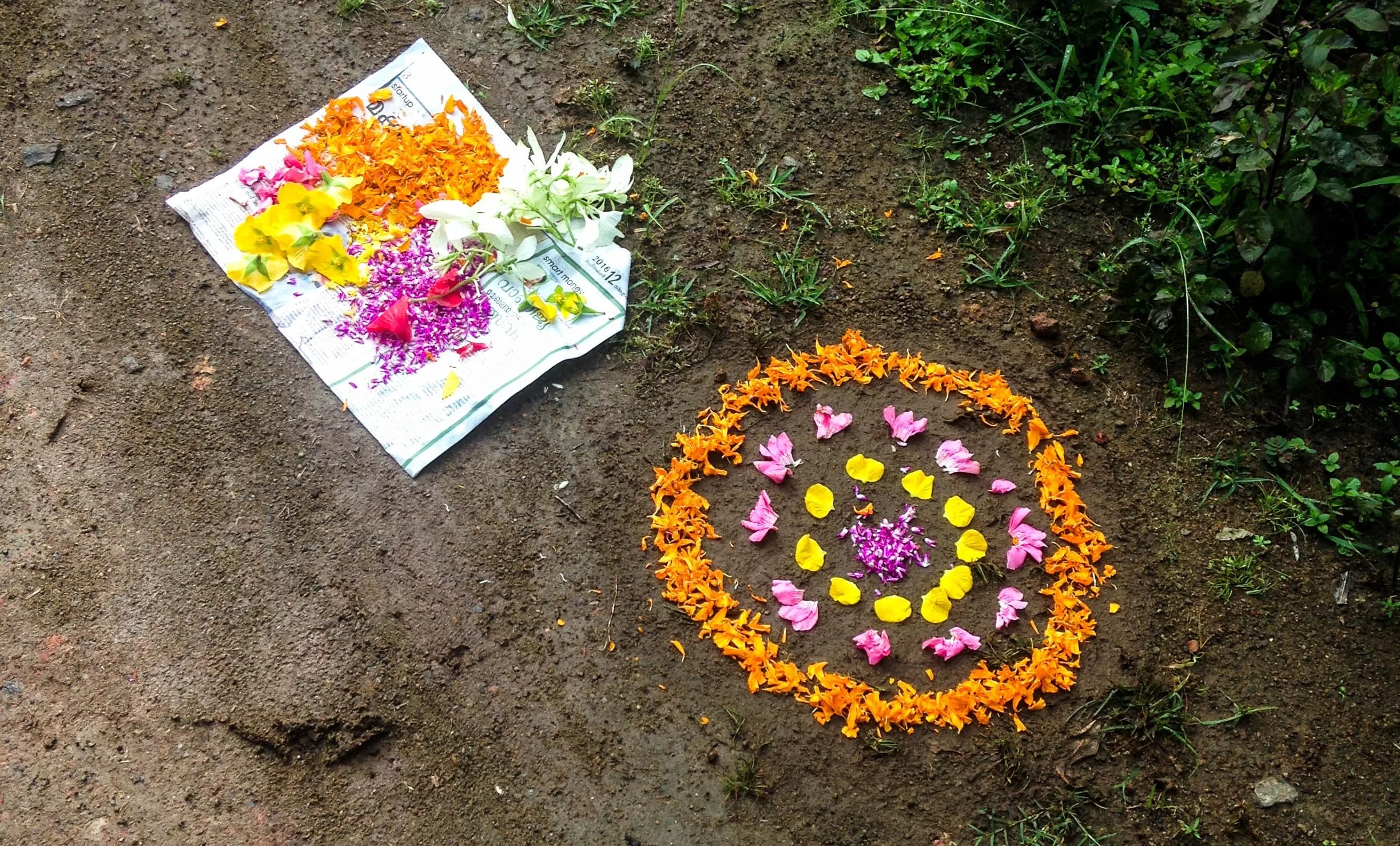 അനിഴം: അഞ്ചാം ദിവസം പലതരം പൂക്കൾ ഉപയോഗിച്ച് പൂക്കളം മനോഹരമാക്കുന്നു.