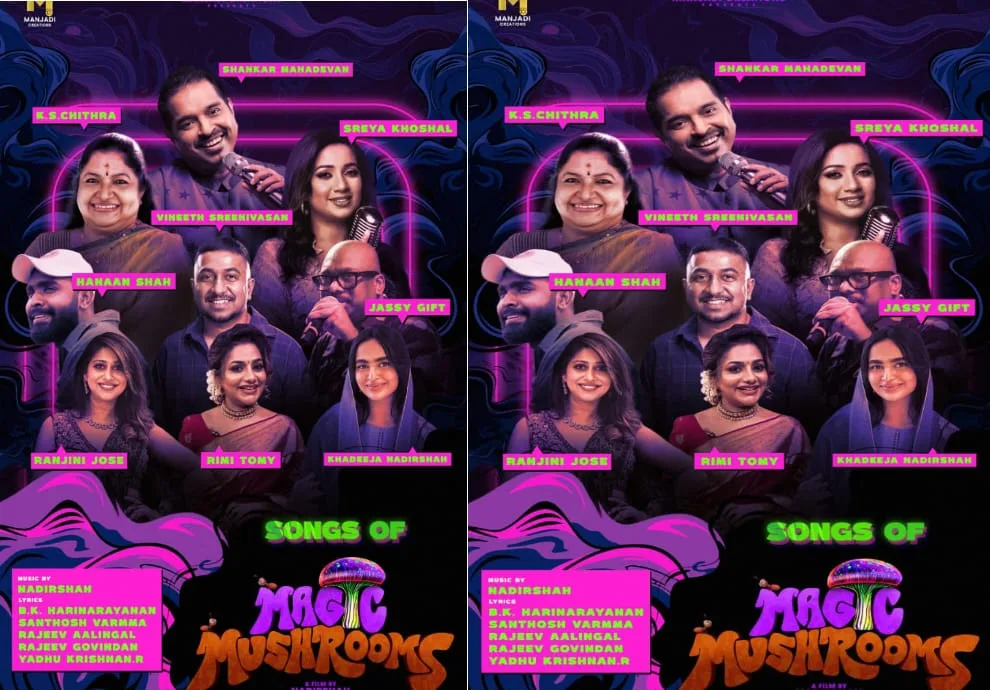 ദക്ഷിണേന്ത്യയിലെ ഏറ്റം മികച്ച ഒമ്പതു പ്രശസ്ത ഗായകരുടെ സംഗമമാണ് ഈ ചിത്രത്തിലുള്ളത്. മലയാളത്തിൻ്റെ വാനമ്പാടി കെ.എസ്. ചിത്ര, ബോളിവുഡ് അടക്കം ഇൻഡ്യയിലെ നിരവധി ഭാഷകൾക്കു പ്രിയങ്കരിയായ ശ്രേയാ ഘോഷാൽ, ശങ്കർ മഹാദേവൻ, വേറിട്ട ശബ്ദത്തിലൂടെ മലയാളികളുടെ പ്രിയ ഗായകൻ ജാസി ഗിഫ്റ്റ്, വിനീത് ശ്രീനിവാസൻ, ഹനാൻഷാ.റിമി ടോമി, രഞ്ജിനി ജോസ്, ഖദീജ നാദിർഷ, എന്നീ ഗായകരാണ് ഈ ചിത്രത്തിനു വേണ്ടി ആലാപനം നടത്തുന്നത്. ഒരു പക്ഷെ ഇത്രയും പ്രശസ്ത ഗായകരുടെ സംഗമം ഉണ്ടാകുന്ന ഒരു ചിത്രം സമീപകാലത്ത് മാജിക് മഷ്റൂം തന്നെയെന്നു തന്നെ പറയാം.