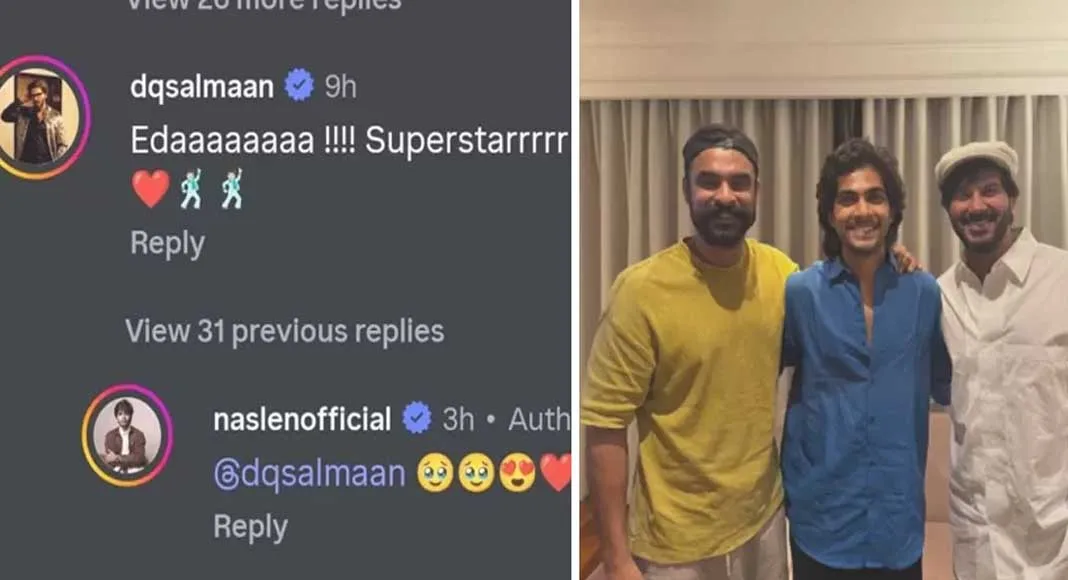 ‘സൂപ്പർസ്റ്റാറുകളുടെ ഇടയിൽ’ എന്ന അടിക്കുറിപ്പോടെയാണ് നസ്ലിൻ ആ ചിത്രം പങ്കുവെച്ചത്. നസ്ലിന്റെ പോസ്റ്റിന് ‘എടാ സൂപ്പർസ്റ്റാറെ…’ എന്നാണ് ദുൽഖർ കമന്റ് ചെയ്തത്. ലൗവ് ഇമോജിയാണ് മറുപടിയായി നസ്ലിൻ നൽകിയത്. കൂടാതെ കല്യാണി പ്രിയദർശൻ, ടൊവിനോ തോമസ്, അരുൺ കുര്യൻ തുടങ്ങിയ താരങ്ങളും കമന്റുമായി എത്തി.