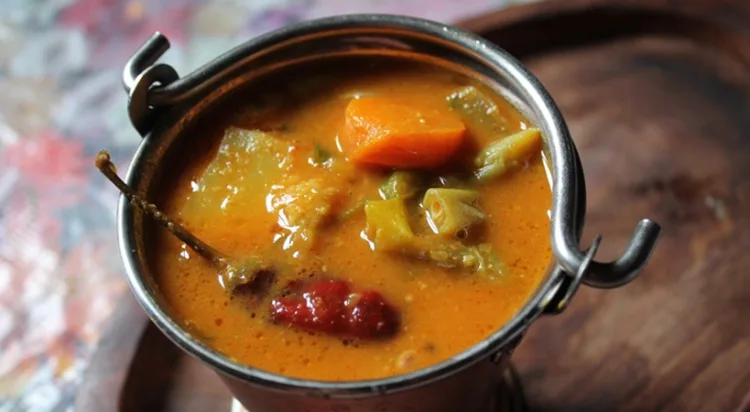 ഒരു വലിയ ചട്ടിയില് 1tbsp വെളിച്ചെണ്ണ ചൂടാക്കി ചെറിയ ഉള്ളി ചേര്ത്ത് 2-3 മിനിറ്റ് വഴറ്റുക. പിന്നീട് അരിഞ്ഞ് വെച്ച പച്ചക്കറികളും, മുരിങ്ങാക്കോലും , പച്ചമുളകും ചേര്ത്ത് 2-3 മിനിറ്റ് വഴറ്റിയതിന് ശേഷം പുളി നീരും, ഉപ്പും, 1/4 tsp മഞ്ഞള്പൊടിയും, പച്ചക്കറികൾ മൂടുന്നത്ര വെള്ളവും ചേര്ത്ത് മൂടിവെച്ച് വേവിക്കുക.