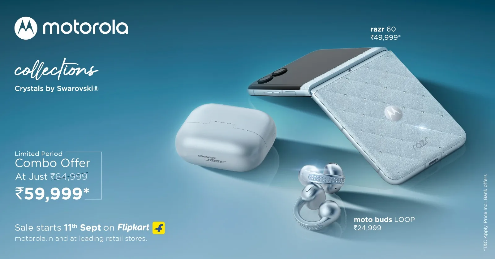 പാന്റോണ് ഐസ് മെല്റ്റ് ഫിനിഷോട് കൂടിയ ത്രി ഡി ക്വില്റ്റഡ് ലെതര് ഡിസൈനുള്ള മോട്ടോറോള റേസര് 60ല് 35 സ്വരോവ്സ്ക്കി ക്രിസ്റ്റലുകള് ഉള്പ്പെടുന്നു. 49,999 രൂപയാണ് മോട്ടോറോള റേസര് 60ന്റെ സ്വരോവ്സ്ക്കി എഡിഷന്റെ വില.
