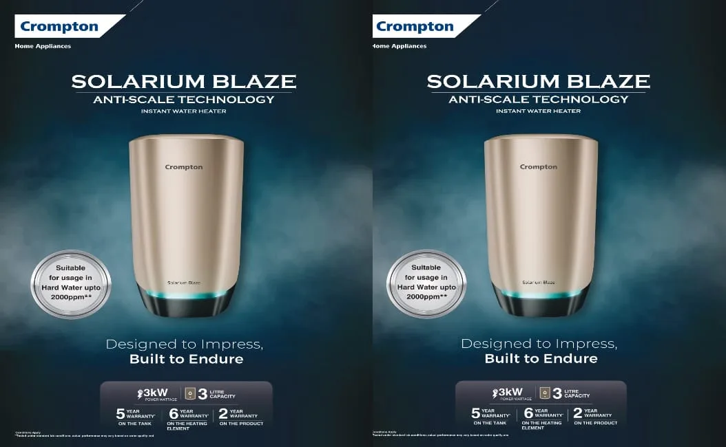 കൊച്ചി: ഉപയോഗക്ഷമതയും രൂപഭംഗിയും ഒരുമിച്ച് വരുന്ന സോളാരിയം ബ്ലേസ് വാട്ടർ ഹീറ്ററുകൾ അവതരിപ്പിച്ച് ക്രോംപ്ടൺ ഗ്രീവ്സ് കൺസ്യൂമർ ഇലക്ട്രിക്കൽസ് ലിമിറ്റഡ്. സ്വർണ്ണ മെറ്റാലിക് ഫിനിഷിൽ പ്രത്യേകം രൂപകൽപ്പന ചെയ്ത ആന്റി-സ്കെയിൽ കോട്ടിംഗ് ഉള്ള സോളാരിയം ബ്ലേസ്, 2000 പിപിഎം വരെ ടിഡിഎസ് ലെവലുകളുള്ള ഘനജല സാഹചര്യങ്ങളിൽ ഉപയോഗിക്കുന്നതിന് അനുയോജ്യമുള്ളതുമാണ്. 3കെഡബ്ല്യു പവർ വാട്ടേജ്, 3 ലിറ്റർ ശേഷി, ചൂടാക്കൽ ഘടകത്തിന് 6 വർഷവും ടാങ്കിന് 5 വർഷവും മൊത്തത്തിൽ ഉൽപ്പന്നത്തിന് 2 വർഷവും വാറന്റി എന്നിവയുമുണ്ട്. തുരുമ്പെടുക്കാത്ത, വൈഡ്-ആംഗിൾ എൽഇഡി ഇൻഡിക്കേർ വരുന്ന മിനുസമാർന്നതും ഒതുക്കമുള്ളതുമായ സോളാരിയം ബ്ലേസിന്റെ രൂപകല്പന പ്രവർത്തനക്ഷമതയോടൊപ്പം സമകാലിക ഇന്റീരിയറുകളുമായി യോജിക്കുന്നതുമാണ്.
