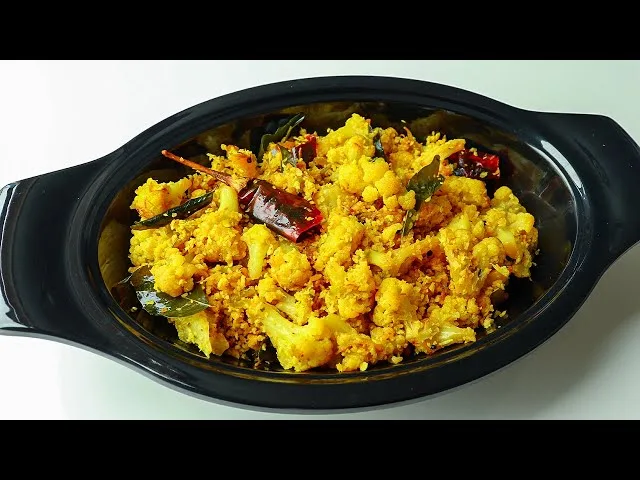 കോളിഫ്ളോർ ചെറിയ കഷ്ണങ്ങളാക്കി മുറിച്ച്, ഉപ്പും മഞ്ഞൾപ്പൊടിയും ചേർത്ത വെള്ളത്തിൽ 5 മിനിറ്റ് നേരം തിളപ്പിക്കുക. പിന്നീട് വെള്ളം ഊറ്റിക്കളയുക.