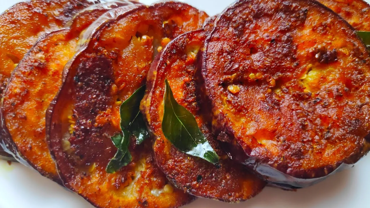 ഒരു പാനിൽ എണ്ണ ചൂടാക്കി, മസാല പുരട്ടിയ വഴുതനങ്ങ കഷ്ണങ്ങൾ ഇട്ട് ഗോൾഡൻ ബ്രൗൺ നിറമാകുന്നതുവരെ വറുത്തെടുക്കുക.