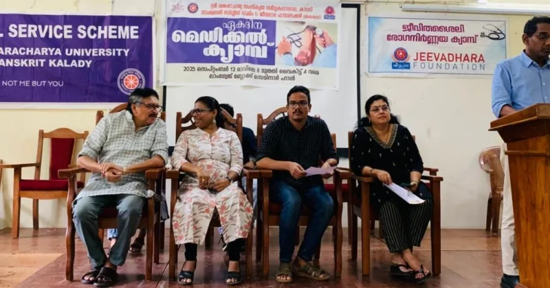ശ്രീശങ്കരാചാര്യ സംസ്കൃത സർവകലാശാലയിലെ നാഷണൽ സർവീസ് സ്കീം (എൻ എസ് എസ്) യൂണിറ്റുകളുടെ ആഭിമുഖ്യത്തിൽ അങ്കമാലി ജീവധാര ഫൗണ്ടേഷനും ശ്രീനാരായണ ഇൻസ്റ്റിറ്റ്യൂട്ട് ഓഫ് മെഡിക്കൽ സയൻസുമായി സഹകരിച്ച് കാലടി മുഖ്യ ക്യാമ്പസിലെ അധ്യാപക, അനധ്യാപക, വിദ്യാർത്ഥികൾക്കായി സംഘടിപ്പിച്ച മെഡിക്കൽ ക്യാമ്പും ബോധവൽക്കരണ സെമിനാറും രജിസ്ട്രാർ ഡോ. മോത്തി ജോർജജ് ഉദ്ഘാടനം ചെയ്യുന്നു. നാഷണൽ സർവീസ് സ്കീം പ്രോഗ്രാം കോഓർഡിനേറ്റർ ഡോ . കെ. എൽ. പദ്മദാസ്, വിദ്യാർത്ഥി സേവന വിഭാഗം ഡയറക്ടർ ഡോ. ശർമിള ആർ., ജീവധാര ഫൗണ്ടേഷൻ ചെയർമാൻ സാജു ചാക്കോ, പ്രോഗ്രാം ഓഫീസർ ഡോ. ജെൻസി എം. എന്നിവർ സമീപം.