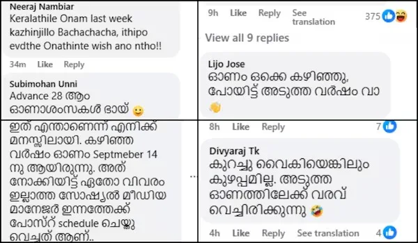 കസവ് മുണ്ടും ഷര്‍ട്ടും പൊന്നാടയും ധരിച്ച ചിത്രത്തിനൊപ്പം മലയാളത്തിലാണ് താരം ആശംസ പങ്കുവെച്ചത്. താരത്തിന് തിരിച്ചും ഓണാശംസകള്‍ അറിയിച്ച ശേഷമാണ് പലരും തെറ്റ് ചൂണ്ടിക്കാണിച്ചത്. കഴിഞ്ഞ വര്‍ഷം ഓണം സെപ്റ്റംബര്‍ 14-ന് ആയിരുന്നെന്നും എന്നാല്‍ എല്ലാ തവണയും ഒരേ തീയതിയില്‍ ആവില്ലെന്നും പലരും താരത്തെ ഓര്‍മിപ്പിച്ചു. സാമൂഹിക മാധ്യമങ്ങള്‍ കൈകാര്യം ചെയ്യുന്നവരെ ഇക്കാര്യം അറിയിക്കണമെന്നും പലരും ആവശ്യപ്പെട്ടു. ‘ഓണം ഒക്കെ കഴിഞ്ഞു, പോയി അടുത്ത വര്‍ഷം വാ’, എന്നും ചിലര്‍ ട്രോളുന്നുണ്ട്.’ഇത്ര പെട്ടെന്ന് തന്നെ വേണോ, ഇനിയും ഒരുവര്‍ഷം കൂടിയുണ്ട് ഓണത്തിന്’, എന്ന് ചിലര്‍ പരിഹാസരൂപേണ ഓര്‍മപ്പെടുത്തി. അതേസമയം, നമ്മള്‍ മലയാളികള്‍ക്ക് എപ്പോഴും ഓണമാണെന്നും നെഗറ്റീവ് കമന്റുകളെ അവഗണിക്കൂ എന്നും ചിലര്‍ അഭിപ്രായപ്പെടുന്നുണ്ട്. പോസ്റ്റ് തെറ്റിദ്ധരിച്ച് ഓണാശംസ നേര്‍ന്ന് ചില മറുനാട്ടിലുള്ളവരും കമന്റ് ബോക്‌സിലുണ്ട്.