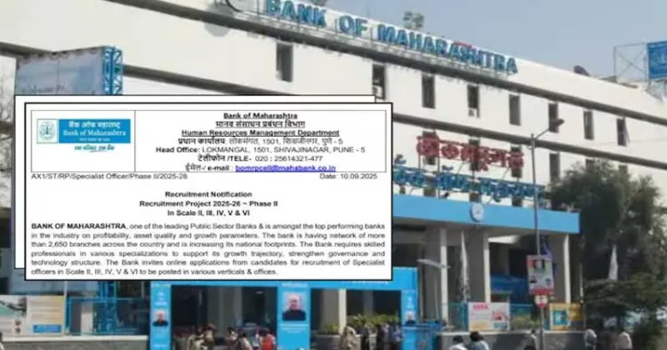 ബാങ്ക് ഓഫ് മഹാരാഷ്ട്ര, അസിസ്റ്റന്റ് ജനറൽ മാനേജർ, ചീഫ് മാനേജർ, മറ്റ് തസ്തികകൾ എന്നിവയുൾപ്പെടെ സ്കെയിൽ II, III, IV, V, VI എന്നീ തസ്തികകളിലെ 350 സ്പെഷ്യലിസ്റ്റ് ഓഫീസർ തസ്തികകളിലേക്കുള്ള നിയമനം പ്രഖ്യാപിച്ചു. ഓൺലൈൻ അപേക്ഷാ പ്രക്രിയ 2025 സെപ്റ്റംബർ 10 ന് ആരംഭിച്ച് 2025 സെപ്റ്റംബർ 30 വരെ തുറന്നിരിക്കും.