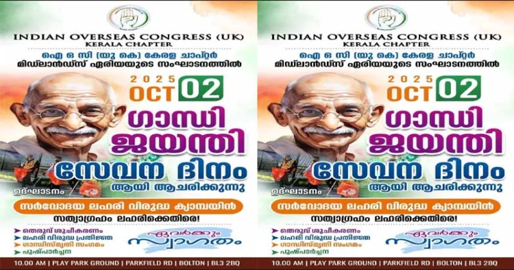 ഐ ഒ സി (യു കെ) – കേരള ചാപ്റ്ററിന്റെ നേതൃത്വത്തിൽ ഗാന്ധി ജയന്തി ദിനം ‘സേവന ദിനം’ ആയി ആചരിക്കും. ശ്രമദാനത്തിന്റെ ഭാഗമായി പ്രവർത്തകർ ബോൾട്ടൻ കൗൺസിലുമായി ചേർന്നു മാലിന്യം നിറഞ്ഞ തെരുവുകൾ ശുചീകരിക്കും. രാവിലെ 10 മണി മുതൽ ബോൾട്ടൻ പ്ലേ പാർക്ക്‌ ഗ്രൗണ്ടിൽ വച്ച് സംഘടിപ്പിക്കുന്ന പരിപാടിയിൽ ജന പ്രതിനിധികൾ, സാമൂഹ്യ പ്രവർത്തകർ, വിവിധ യൂണിറ്റ് / റീജിയനുകളിൽ നിന്നുള്ള ഐ ഒ സി പ്രവർത്തകർ എന്നിവർ പങ്കെടുക്കും. കേരള ചാപ്റ്റർ പ്രസിഡന്റ്‌ ഷൈനു ക്ലെയർ മാത്യൂസ് ലഹരി വിരുദ്ധ പ്രതിജ്ഞ അംഗങ്ങൾക്ക് ചൊല്ലിക്കൊടുക്കും.