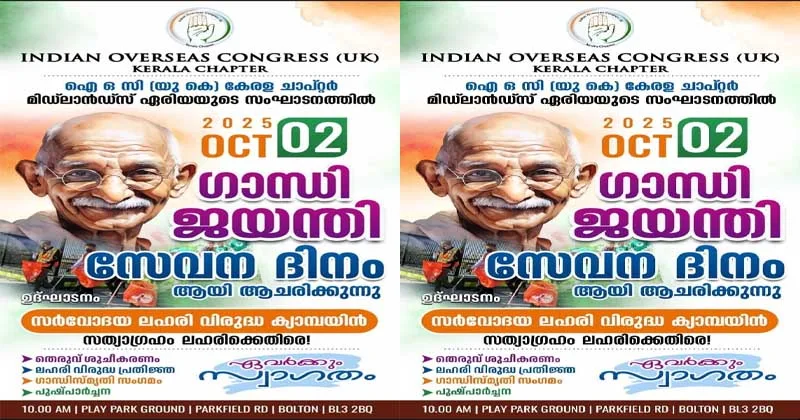 ഐ ഒ സി (യു കെ) – കേരള ചാപ്റ്ററിന്റെ നേതൃത്വത്തിൽ ഗാന്ധി ജയന്തി ദിനം ‘സേവന ദിനം’ ആയി ആചരിക്കും. ശ്രമദാനത്തിന്റെ ഭാഗമായി പ്രവർത്തകർ ബോൾട്ടൻ കൗൺസിലുമായി ചേർന്നു മാലിന്യം നിറഞ്ഞ തെരുവുകൾ ശുചീകരിക്കും. രാവിലെ 10 മണി മുതൽ ബോൾട്ടൻ പ്ലേ പാർക്ക്‌ ഗ്രൗണ്ടിൽ വച്ച് സംഘടിപ്പിക്കുന്ന പരിപാടിയിൽ ജന പ്രതിനിധികൾ, സാമൂഹ്യ പ്രവർത്തകർ, വിവിധ യൂണിറ്റ് / റീജിയനുകളിൽ നിന്നുള്ള ഐ ഒ സി പ്രവർത്തകർ എന്നിവർ പങ്കെടുക്കും. കേരള ചാപ്റ്റർ പ്രസിഡന്റ്‌ ഷൈനു ക്ലെയർ മാത്യൂസ് ലഹരി വിരുദ്ധ പ്രതിജ്ഞ അംഗങ്ങൾക്ക് ചൊല്ലിക്കൊടുക്കും.