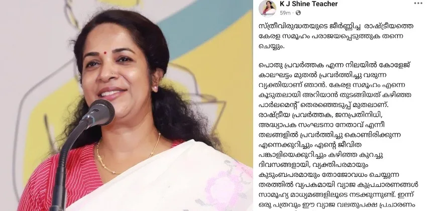 സ്വന്തം നഗ്നത മറച്ചുപിടിക്കാന് മറ്റുള്ളവരുടെ ഉടുതുണി പറിച്ചെടുക്കുന്ന രാഷ്ട്രീയ പാപ്പരത്തം അവസാനിപ്പിക്കാന് ഇതിന് പിന്നില് പ്രവര്ത്തിച്ചവര് തയ്യാറാവണമെന്ന് കെ.ജെ. ഷൈന് ഫെയ്സ്ബുക്ക് പോസ്റ്റില് ആവശ്യപ്പെട്ടു. പൊതുപ്രവര്ത്തനം നടത്തുന്നത് സ്ത്രീകളുടെ കൂടി അവകാശമാണെന്ന ബോധ്യം വരുന്ന തരത്തില് പൊതുസമൂഹവും ഭരണകൂടവും വേണ്ട ഇടപെടല് നടത്തുമെന്ന വിശ്വാസം ഉണ്ട്.ഒരു കാരണവശാലും പൊതു പ്രവര്ത്തനരംഗത്ത് നില്ക്കുന്ന ഒരു സ്ത്രീയും ഭയപ്പെടരുത്. എത്രയോ പ്രയാസങ്ങളും അപവാദ പ്രചരണങ്ങളും നേരിട്ടവരാണ് നമുക്ക് മുമ്പേ സഞ്ചരിച്ചവര്. ഈ സാഹചര്യവും നാമൊരുമിച്ച് നേരിടും, മുന്നേറുമെന്നും കെ.ജെ. ഷൈന് പറഞ്ഞു.