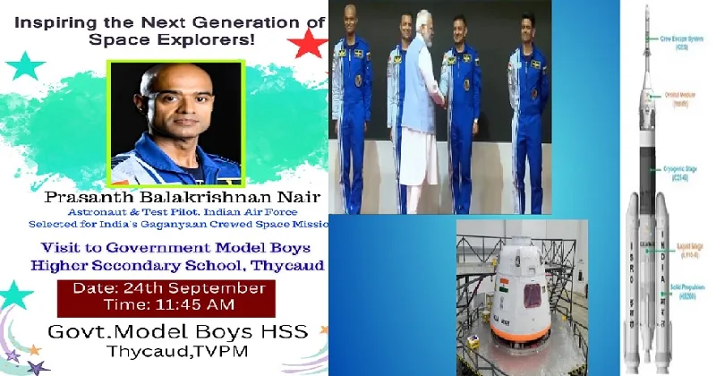 ഇന്ത്യയുടെ അഭിമാന ദൗത്യമായ ഗഗന്‍യാനിലേക്ക് തിരഞ്ഞെടുക്കപ്പെട്ട ബഹിരാകാശ സഞ്ചാരിയും ഇന്ത്യന്‍ വ്യോമസേനയിലെ ടെസ്റ്റ് പൈലറ്റുമായ പ്രശാന്ത് ബാലകൃഷ്ണന്‍ നായര്‍ തൈക്കാട് ഗവ. മോഡല്‍ ബോയ്‌സ് ഹയര്‍ സെക്കന്‍ഡറി സ്‌കൂളില്‍ സന്ദര്‍ശനം നടത്തുന്നു. സെപ്റ്റംബര്‍ 24-ന് രാവിലെ 11:45-നാണ് അദ്ദേഹം സ്‌കൂളിലെത്തുന്നത്. ‘ഇന്‍സ്പയറിംഗ് ദ നെക്സ്റ്റ് ജനറേഷന്‍ ഓഫ് സ്‌പേസ് എക്‌സ്‌പ്ലോറേഴ്‌സ്’ എന്ന പേരില്‍ വിദ്യാര്‍ത്ഥികളുമായി സംവദിക്കുന്ന പരിപാടിയിലാണ് പ്രശാന്ത് നായര്‍ പങ്കെടുക്കുക. ഇന്ത്യയുടെ ബഹിരാകാശ സ്വപ്നങ്ങള്‍ക്ക് ചിറകു നല്‍കുന്ന ഗഗന്‍യാന്‍ ദൗത്യത്തെക്കുറിച്ചും, ബഹിരാകാശ ഗവേഷണ രംഗത്തെ പുതിയ സാധ്യതകളെക്കുറിച്ചും അദ്ദേഹം കുട്ടികളുമായി സംസാരിക്കും.