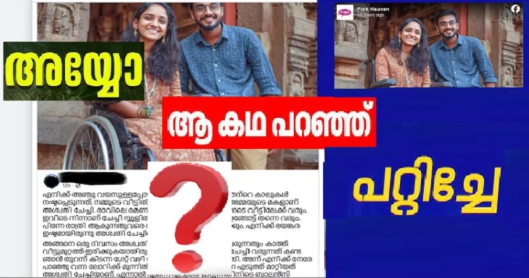 ‘എന്റെ ജീവന് രക്ഷിക്കാന് കാലുകള് നഷ്ടപ്പെടുത്തിയ അശ്വതി ചേച്ചിയെ ഞാന് എന്റെ ജീവിതത്തിലേക്ക് കൂട്ടുകയാണ്. പ്രായം കൊണ്ട് അഞ്ച് വയസിന് മൂത്തവള്, ഇരുകാലുകളും നഷ്ടപ്പെട്ടവള്, വീട്ടില് ജോലിക്ക് നിന്ന സ്ത്രീയുടെ മകള്, ജാതിയില് താഴ്ന്നവള്, സാമ്പത്തികമായി പിന്നോട്ട് നിക്കുന്നവര്. അങ്ങനെ ഒരുപാട് കടമ്പകള് കടന്നാണ് ഈ വിവാഹത്തിലേക്ക് എത്തിച്ചേര്ന്നത്’ എന്നാണ് കഥയുടെ തുടക്കത്തില് കുറിച്ചിരിക്കുന്നത്. ഇലക്ട്രിക് വീല് ചെയറില് ഇരിക്കുന്ന ഒരു യുവതിയോടൊപ്പം ഒരു യുവാവിന്റെ AIചിത്രം പങ്കുവച്ചുകൊണ്ടാണ് കഥ ഫേസ്ബുക്കില് പങ്കുവച്ചിരിക്കുന്നത്. യാഥാര്ഥ്യമെന്ന് ആദ്യ വായനയില് തന്നെ തോന്നിപ്പിക്കുന്ന കഥാവതരണം വായനക്കാരെ തെറ്റിദ്ധരിപ്പിച്ചിട്ടുണ്ട്. ആ കഥയ്ക്കു താഴെ വന്നിരിക്കുന്ന കമന്റുകള് വായിച്ചാല് അത് മനസ്സിലാകും.
