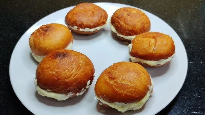 കുഴച്ചു വച്ചിരിക്കുന്ന മാവ് നന്നായി പൊങ്ങുമ്പോൾ വീണ്ടും ഒന്ന് കുഴച്ച് ചെറിയ ബോളുകൾ ആക്കി മാറ്റാം. ഇത് വീണ്ടും പൊങ്ങാൻ മാറ്റി വയ്ക്കുക. ശേഷം എടുത്ത് കൈകൊണ്ട് അമർത്തി ഒന്ന് പരത്തുക. ശേഷം മുകളിൽ ക്രീം വയ്ക്കുക. ഇനി രണ്ട് സൈഡും നിന്നും വലിച്ചെടുത്ത് ക്രീം ഉള്ളിൽ വരത്തക്ക രീതിയിൽ കവർ ചെയ്തെടുക്കുക. എല്ലാം ഇങ്ങനെ ചെയ്തശേഷം ബേക്കിംഗ് ട്രേയിൽ നിരത്തി വയ്ക്കാം ഇനി 20 മിനിറ്റ് ബേക്ക് ചെയ്ത് എടുക്കാം.