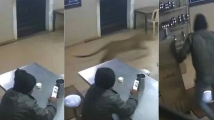 കാട്ടിൽ നിന്ന് നാട്ടിലേക്ക് വന്യമൃഗങ്ങൾ ഇറങ്ങുന്ന വാർത്ത ഇപ്പോൾ സർവ്വസാധാരണയാണ്. എന്നാൽ, ഒരു പൂച്ചയെ പിടിക്കാനായി ഹോട്ടലിലേക്ക് പാഞ്ഞു കയറുന്ന പുലിയുടെ ദൃശ്യങ്ങളാണ് ഇപ്പോൾ നെറ്റിസൻസിനിടയിലെ താരം. പൂച്ചയ്ക്ക് പിന്നാലെ ഹോട്ടലിലൂടെ പുലി ഓടുന്നതും, ഈ സമയം ചായ കുടിച്ചുകൊണ്ടിരുന്ന മനുഷ്യന് ഓടി രക്ഷപ്പെടുന്നതുമാണ് വൈറലായ സിസിടിവിയില് ദൃശ്യങ്ങളിൽ കാണാൻ കഴിയുന്നത്. ഒരു സിനിമയിലെ രംഗംപോലെ തോന്നുമെങ്കിലും, തലനാരിഴയ്ക്കായിരുന്നു ചായ കുടിച്ചുകൊണ്ടിരുന്ന മനുഷ്യന് രക്ഷപ്പെട്ടത്.