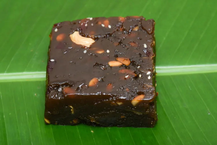 മിശ്രിതം പാനിൽ ഒട്ടിപ്പിടിക്കാതെ ഒരുമിച്ചു കൂടുകയും, എണ്ണ തെളിഞ്ഞു തുടങ്ങുകയും ചെയ്യുമ്പോൾ തീ അണയ്ക്കുക. ഇതിലേക്ക് ഏലയ്ക്ക പൊടിയും വറുത്ത നട്സും ചേർത്ത് യോജിപ്പിക്കുക.