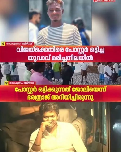 തമിഴ്നാട്ടിലെ നാഗപട്ടണത്തിൽ സിനിമ പോസ്റ്ററുകളും, പാർട്ടി പോസ്റ്ററുകളും ഒട്ടിച്ച് ഉപജീവനം നടത്തിയിരുന്ന പയ്യൻ ആണ് ഭരത് രാജ്. കരൂർ ദുരന്തത്തിന് പിറകെ വിജയിക്ക് എതിരെ, വിജയ് യെ അറസ്റ്റ് ചെയ്യുക എന്ന തലകെട്ടോട് കൂടിയുള്ള പോസ്റ്ററുകൾ ഒട്ടിക്കാൻ നിർദ്ദേശം വന്നതിനെ തുടർന്ന്, പതിവ് പോലെ അവൻ അവന്റെ ജോലികൾ തുടർന്നു ഈ സമയം അത് വഴി വന്ന നാഗപട്ടണം Tvk പാർട്ടി നേതാക്കൾ, അവനെ ഭീഷണി പെടുത്തുകയും, കയ്യേറ്റം ചെയ്യാൻ ശ്രമിക്കുകയും ചെയ്തു, ഞാൻ ഒരു പാർട്ടിയിലും ഇല്ല, എനിക്ക് ആരോടും വിരോധവും ഇല്ല, ഒരു ദിവസത്തെ കൂലിക്ക് വേണ്ടി വന്നതാണ് ഞാൻ എന്നും, പോസ്റ്റർ ഒട്ടിക്കാൻ ഏർപ്പാട് ആക്കിയ വ്യക്തിയുടെ പേര് അടക്കം ഭരത് രാജ് പറഞ്ഞിട്ടും, Tvk അനുഭാവികൾ അവന്റെ വീഡിയോ എടുത്ത് സോഷ്യൽ മീഡിയകളിലും, അവരുടെ വാട്സ്ആപ്പ് ഗ്രൂപ്പുകളിലും വ്യാപകമായി പ്രചരിപ്പിച്ചു