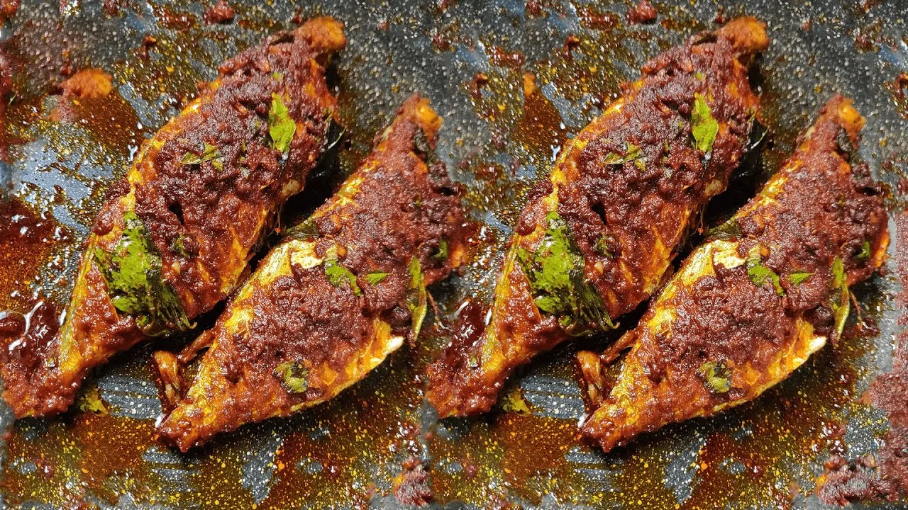 എല്ലാ മസാലകളും, ഉള്ളി, ഇഞ്ചി, വെളുത്തുള്ളി, പച്ചമുളക്, ഇലകൾ, നാരങ്ങാനീര് എന്നിവ ചേർത്ത് മിക്സിയിൽ അരക്കുക. കോൺസ്റ്റാർച്ച് ചേർത്ത് മിക്സ് ചെയ്ത് കട്ടിയുള്ള പേസ്റ്റ് തയ്യാറാക്കുക. മീൻ കഴുകി മുറിച്ച് വരണ്ടതിന് ശേഷം മസാല പുരട്ടി 30 മിനിറ്റ് മാരിനേറ്റ് ചെയ്യുക. പാനിൽ എണ്ണ ചൂടാക്കി മീഡിയം ഫ്ലെയിമിൽ ഷാലോ ഫ്രൈ ചെയ്യുക.