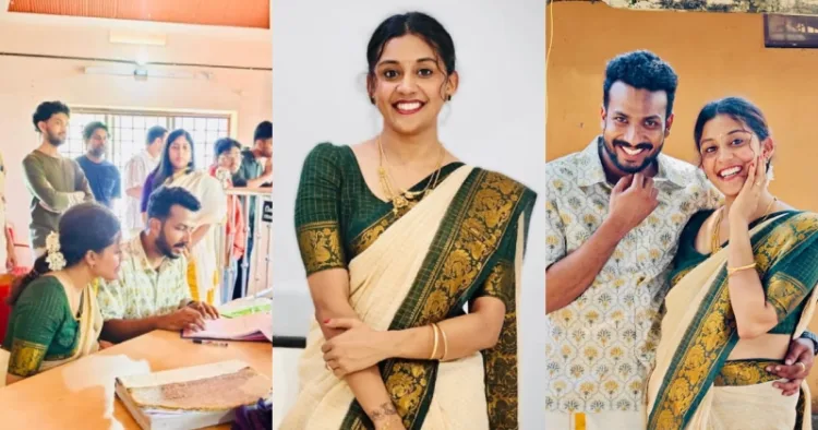 ‘എന്റെ ലോകത്തേക്ക് ഒരു എത്തിനോട്ടം’ എന്ന ക്യാപ്ഷനോടെയാണ് ആര്യ അഭിഷേകിനെ ടാഗ് ചെയ്ത് ‘3/10/ 2025/’ എന്ന തീയതിയോടെ ചിത്രങ്ങള് പങ്കുവെച്ചത്. പച്ചയില് കസവ് പ്രിന്റോടുകൂടിയ കരയുള്ള ഓഫ് വൈറ്റ് സാരിയാണ് ചിത്രങ്ങളില് ആര്യയുടെ വേഷം. ഫ്ളോറല് പ്രിന്റുള്ള ഷര്ട്ടും മുണ്ടുമാണ് അഭിഷേക് വിവാഹത്തിനായി തിരഞ്ഞെടുത്തിരുന്നത്.