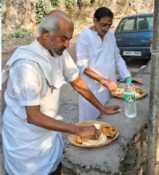 ഒരു ഫോട്ടോയിൽ, എല്ലാ ആഡംബര സുഖങ്ങളിൽ നിന്നും മാറി, റോഡരികിൽ ഒരു ഇലത്തകിടിയിൽ വിളമ്പുന്ന ഒരു ഭക്ഷണം കഴിക്കുന്ന രജനീകാന്തിനെ കാണാം. ലാളിത്യം സ്വീകരിക്കാനുള്ള അദ്ദേഹത്തിന്റെ തീരുമാനത്തെ സോഷ്യൽമീഡിയ വാഴ്ത്തുന്നു.