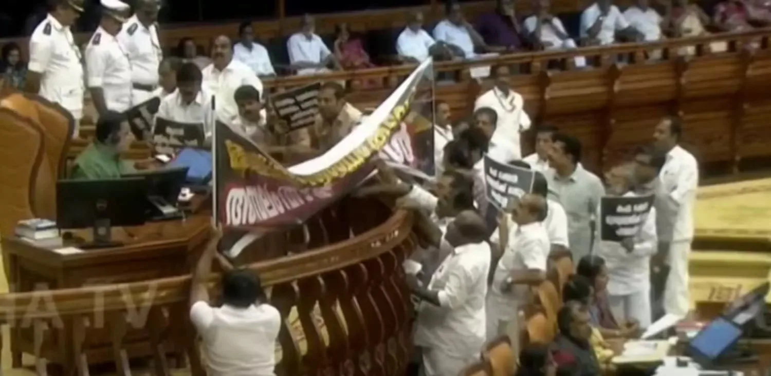സ്പീക്കറുടെ ഡയസിന് മുന്നില്‍ പ്ലക്കാര്‍ഡുകളും ബാനറുകളും ഉയര്‍ത്തിയായിരുന്നു പ്രതിഷേധം.തുടര്‍ന്ന് സഭ നിര്‍ത്തിവെച്ചതായി സ്പീക്കര്‍ എ.എന്‍ ഷംസീര്‍ അറിയിച്ചു.