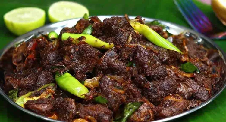 ഇഞ്ചി വെളുത്തുള്ളി പച്ചമുളക് ചതച്ചത് ഉപ്പ് ചേര്ത്ത് ബീഫ് കുക്കറില് വേവിക്കുക. ചട്ടിയില് വെളിച്ചെണ്ണ ഒഴിച്ച് ഉലുവ തേങ്ങാക്കൊത്ത് ഇഞ്ചി വെളുത്തുള്ളി പച്ചമുളക് മൂപ്പിക്കുക. ഇതില് ചുന്നുള്ളി ചേര്ത്ത് പാകത്തിന് ഉപ്പ് ചേര്ത്ത് നന്നായി വഴറ്റുക. മൂത്ത് വരുമ്പോള് ഗരം മസാലയും കുരുമുളക് പൊടിയും ചേര്ക്കുക.. ഇതില് ഏതവഴക്കയും കശുവണ്ടി പരിപ്പും ചേര്ക്കുക അടച്ചു വച്ചു വേവിക്കുക. നന്നായി വെന്തതി ന് ശേഷം തുറന്നു വച്ചു വരട്ടിയെടുക്കുക. ഏറ്റവും ഒടുവില് നാലു വറ്റല്മുളക് മുറിച്ചതും കറിവേപ്പിലയും മല്ലിയിലയും പുതിന യിലയും ചേര്ത്ത് ഇളക്കി വാങ്ങി വയ്ക്കുക ചൂടോടെ നെയ്ച്ചോറിനും പറോട്ടയ്ക്കും ഒപ്പം കഴിക്കാം.