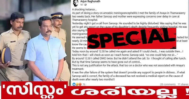 ആ ആക്രമണത്തിന്റെ കാരണം തേടുമ്പോള്, സനൂപിന്റെ വേദന നിറഞ്ഞ ദിവസങ്ങളാണ് നമുക്ക് മുന്നില് തെളിയുന്നത്. മകള് മരിച്ച് രണ്ട് മാസമായിട്ടും മരണകാരണം സംബന്ധിച്ച മെഡിക്കല് റിപ്പോര്ട്ട് കുടുംബത്തിന് കൊടുത്തിരുന്നില്ല. മകളുടെ മരണം അമീബിക് മസ്തിഷ്ക ജ്വരം മൂലമല്ലെന്ന് ചില ഡോക്ടര്മാര് പറഞ്ഞതോടെ സനൂപ് കൂടുതല് ആശയക്കുഴപ്പത്തിലുമായി. മകള് മരിച്ചത് അമീബിക് മസ്തിഷ്ക്ക ജ്വരം മൂലമാണെന്നു പറഞ്ഞതും ജോക്ടര്മാര്, അല്ലെന്നും പറഞ്ഞതും ഡോക്ടര്മാര്.