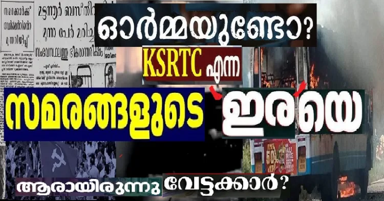 വര്ഷങ്ങള്ക്കു മുമ്പ് വരെ കേരളത്തില് ഏതു രാഷ്ട്രീയ പാര്ട്ടിക്കാര് സമരം ചെയ്താലും അതിന്റെ ഭവിഷ്യത്ത് അനുഭവിച്ചിരുന്നത് KSRTC എന്ന ഏക സര്ക്കാര് വകുപ്പാണ്. നടു റോഡില് നിന്നു കത്തും. കുത്തിക്കീറും, ചില്ല് അടിച്ചു പൊട്ടിക്കും. കല്ലെറിഞ്ഞു തകര്ക്കും. ഇങ്ങനെ നശിപ്പിക്കപ്പെട്ട നിരവധി വാഹനങ്ങള് ഇന്നും KSRTCയുടെ വര്ക്ക് ഷോപ്പുകളില് നിത്യ സ്മാരകങ്ങളായി കിടപ്പുണ്ട്. അതെല്ലാം ഭരണ മാറ്റത്തിനു വേണ്ടി നടത്തിയ രാഷ്ട്രീയ പാര്ട്ടികളുടെ സമരങ്ങളുടെ ഇരകളാണ്. എന്നും KSRTC ബസുകള് കേരളത്തിലെ സമരങ്ങളുടെ നിത്യ ‘ഇര’കള് ആയിരുന്നു. ഇടതുപക്ഷവും വലതു പക്ഷവും KSRTC യെ ഇരയാക്കുന്നതില് മത്സരിച്ചിരുന്ന കാലവും ഉണ്ടായിരുന്നു.